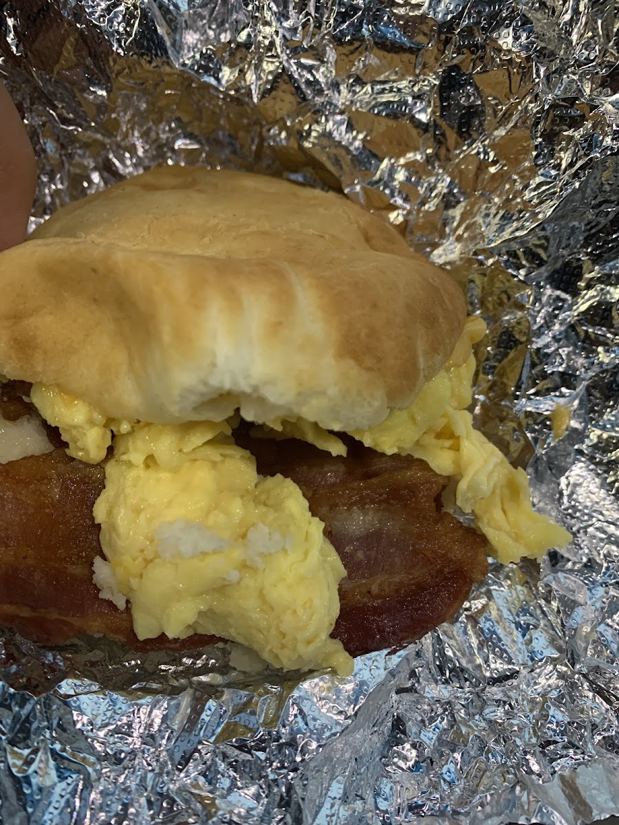 Ordered the bacon, egg, and cheese biscuit also! All three were delicious!! The food tastes like homemade cooking! People were kind and efficient!